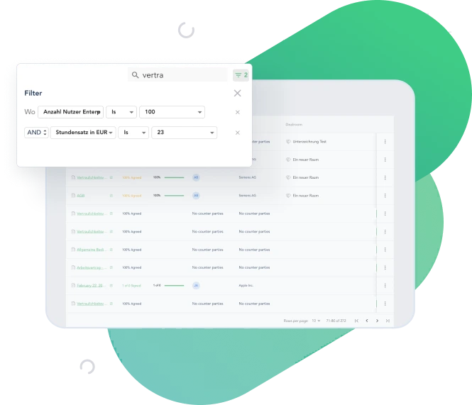 Die richtigen Verträge zu finden, ist oft ein nerviges Spiel. Die Auswertung basierend auf Verträgen (so man sie denn findet) ist noch viel anstrengender. Mit top.legal kann es einfach sein. Gezielte Abfrage nach Vertragsdaten ist der Heilsbringer.