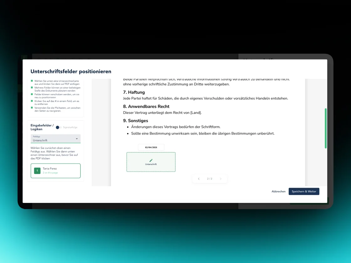 - Intuitives Drag-and-Drop: Platzieren Sie Signatur-, Text- und Datumsfelder millimetergenau direkt im PDF.