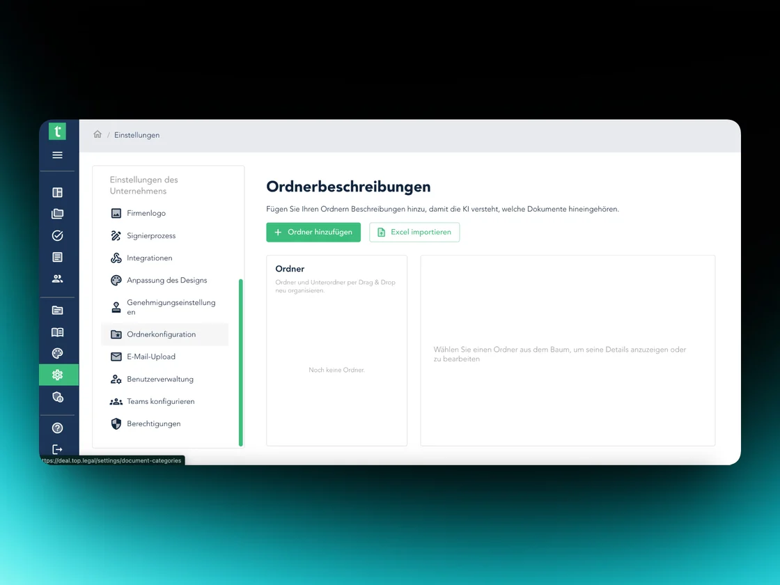 Sie können ab sofort KI-Bewertungsregeln auf Ordnerebene definieren. Nach der Aktivierung prüft die KI automatisch alle Dokumente in Dealrooms dieses Ordners anhand Ihrer festgelegten Kriterien.