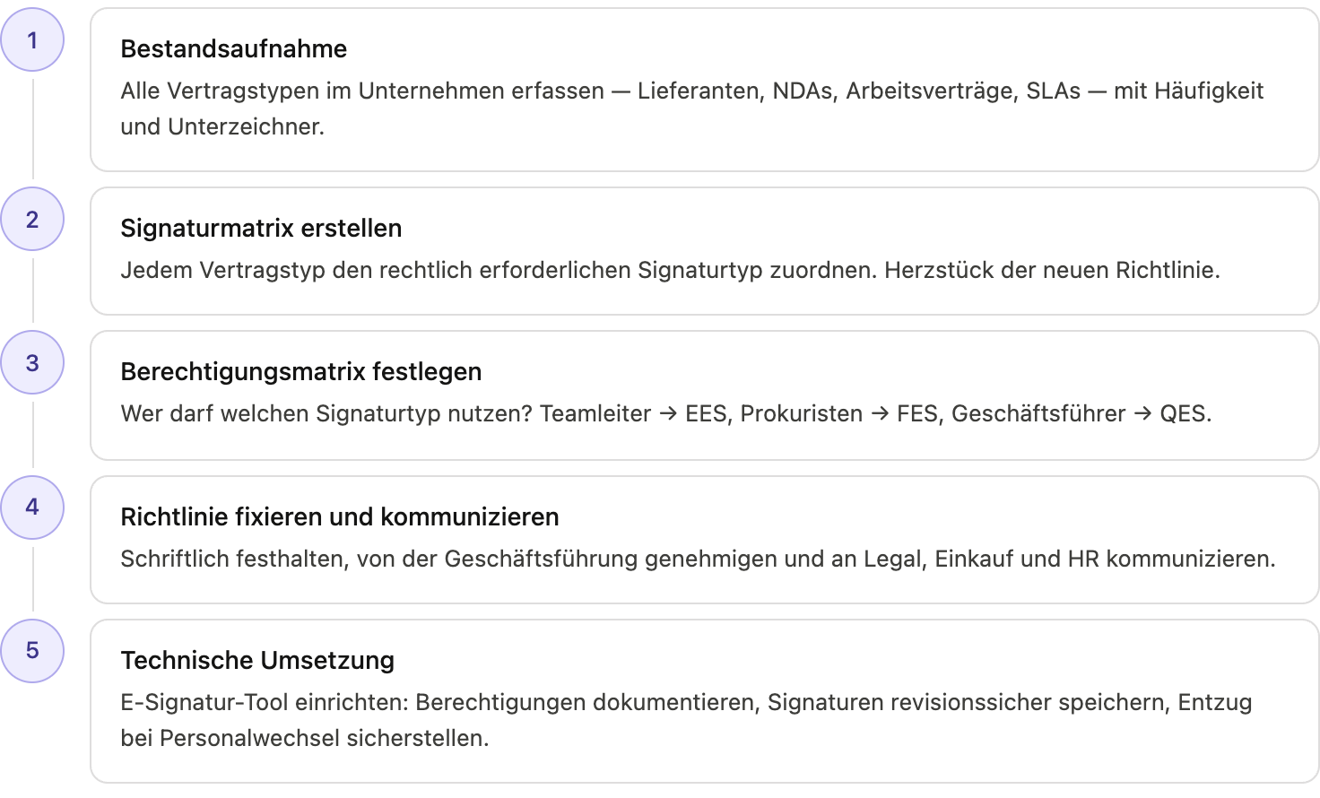 Schritt 4: Richtlinie schriftlich fixieren und kommunizieren Die angepasste Signaturrichtlinie wird schriftlich festgehalten, von der Geschäftsführung genehmigt und an alle relevanten Abteilungen kommuniziert. Legal, Einkauf und HR müssen sie kennen und einhalten.
