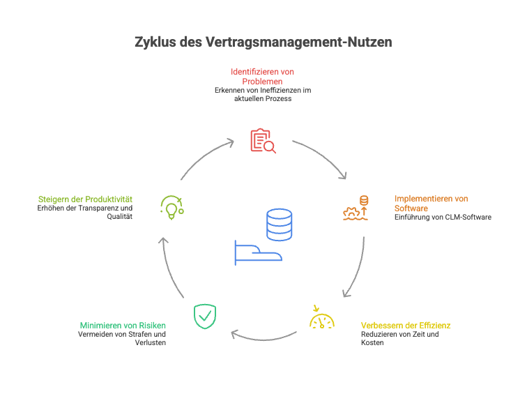 Problem im Vertragschaos: Ohne strukturierte Vertragsverwaltung gehen wichtige Punkte unter. Studien zeigen, dass Unternehmen durch mangelhaften Vertragsprozess bis zu 9 % ihres jährlichen Umsatzes verlieren – etwa durch verpasste Fristen oder entgangene Chancen. Auch die Geschwindigkeit leidet: Verträge dauern länger, weil Abstimmungen stocken oder Dokumente unauffindbar sind.