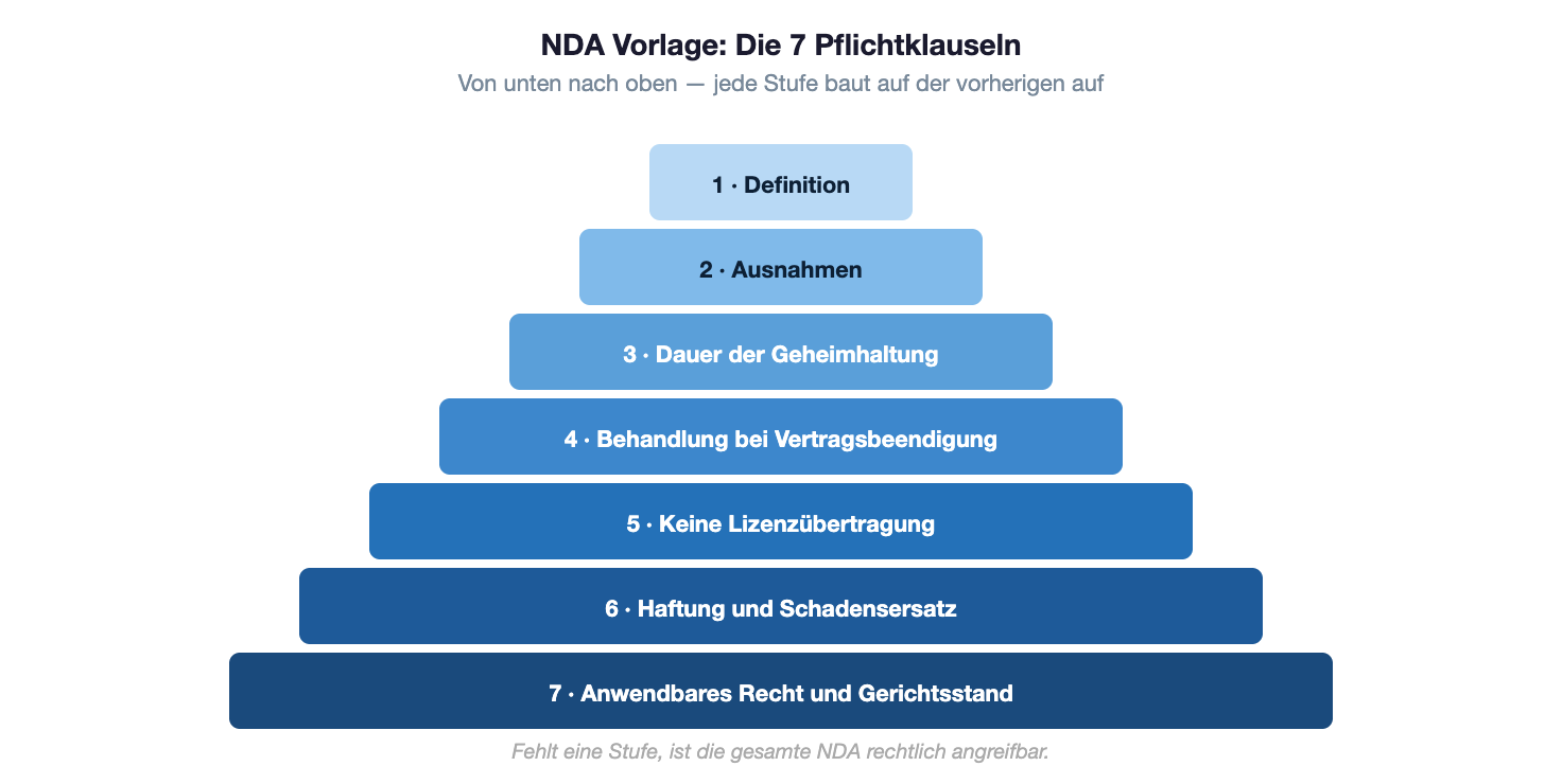 Eine rechtssichere NDA Vorlage braucht sieben Pflichtklauseln: Definition des Geheimen, Ausnahmen, Dauer, Behandlung bei Vertragsende, Nutzungsbeschränkung, Haftung und Gerichtsstand. Kostenlose Vorlagen aus dem Internet erfüllen diese Anforderungen selten vollständig.