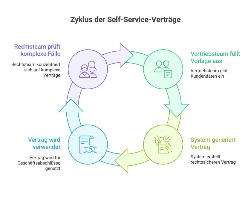 Die Lösung für dieses Problem heißt Self-Service-Verträge. Dabei handelt es sich um einen digitalisierten Vertragsprozess, in dem Vertriebsteams standardisierte Verträge selbstständig, fehlerfrei und innerhalb weniger Minuten erstellen können. So muss niemand mehr tagelang auf einen Vertragsentwurf warten – der Deal kommt schneller zustande, und interne Ressourcen werden spürbar entlastet. Self-Service im Vertragsmanagement steigert die Abschlussquote und gibt Ihrem Vertrieb den entscheidenden Tempo-Vorteil, während die Rechtsabteilung von Routineaufgaben befreit wird und sich auf komplexere Fälle konzentrieren kann. Kurz: Self-Service-Verträge machen Ihren Vertriebsprozess nicht nur schneller, sondern auch effizienter und wettbewerbsfähiger.