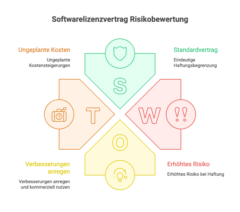 - Gewährleistung & Garantien: Der Anbieter gibt lediglich eine grundsätzliche Funktionsgarantie der Software, jedoch ohne genaue SLA oder Leistungsversprechen. Außerdem schließt er viele Gewährleistungsansprüche aus. Für uns heißt das: Wenn die Software mal hakt, haben wir begrenzte Ansprüche. Risiko: 3 von 5, da wir auf seinen Support vertrauen müssen und im Zweifel selbst Aufwand haben, Probleme zu umschiffen.