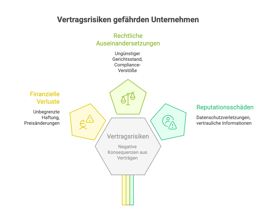 Vertragsrisiken sind potenzielle negative Konsequenzen, die aus Verträgen entstehen können. Sie schlummern in Kleingedrucktem und Klauseln – und werden oft erst bemerkt, wenn es weh tut. Diese Risiken können finanzielle Verluste, rechtliche Auseinandersetzungen oder Reputationsschäden verursachen.