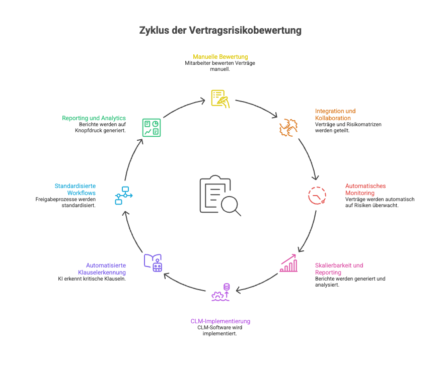 4. Skalierbarkeit und Reporting: Wenn Sie zehn Verträge pro Jahr prüfen, ist Excel prima. Bei hundert wird’s sportlich. Bei tausend ist es unrealistisch, dass all diese Matrizen manuell befüllt und gepflegt werden. Zudem möchten Führungskräfte vielleicht wissen: Wie viele High-Risk-Verträge haben wir gerade im Haus? Welche häufigen Risikomuster treten auf? Aus 200 einzelnen Excel-Dateien aggregiert man solche Insights nur mit großem Aufwand. Ein professionelles Contract Lifecycle Management (CLM)-System hingegen könnte solche Berichte auf Knopfdruck liefern.