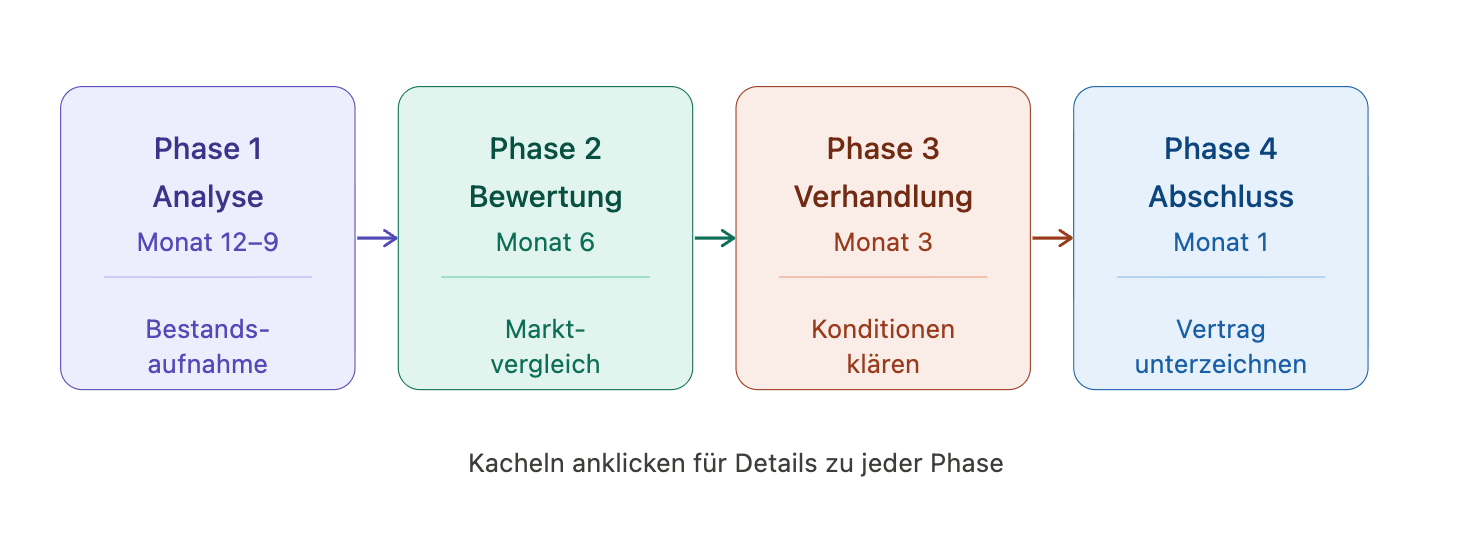 Eine strukturierte Checkliste gliedert den Verlängerungsprozess in 4 Phasen: Analyse (Monat 12 bis 9), Bewertung (Monat 6), Verhandlung (Monat 3) und Abschluss (Monat 1).